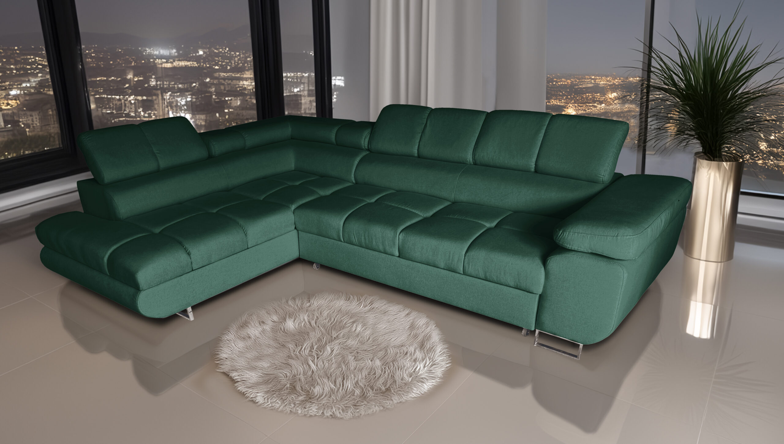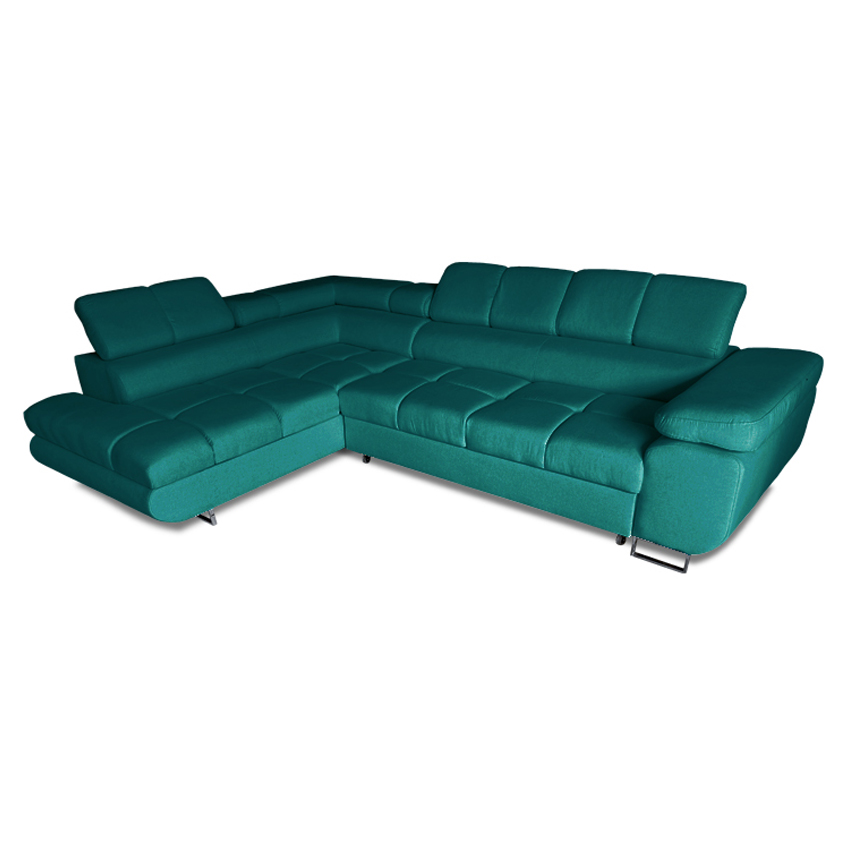 Narożnik dostępny jest w wersji lewo- i prawostronnej oraz w różnych wariantach wykończenia, co pozwala idealnie dopasować go do aranżacji wnętrza. Regulowane zagłówki oraz komfortowe siedziska oparte na sprężynie falistej i piance T30 zapewniają wysoki komfort użytkowania zarówno podczas codziennego wypoczynku, jak i okazjonalnego snu. Funkcja spania z pojemnikiem na pościel sprawia, że mebel doskonale sprawdzi się na co dzień, oferując dodatkową przestrzeń do przechowywania. Eleganckie nóżki w kolorze chromu lub czerni podkreślają nowoczesny charakter narożnika.
