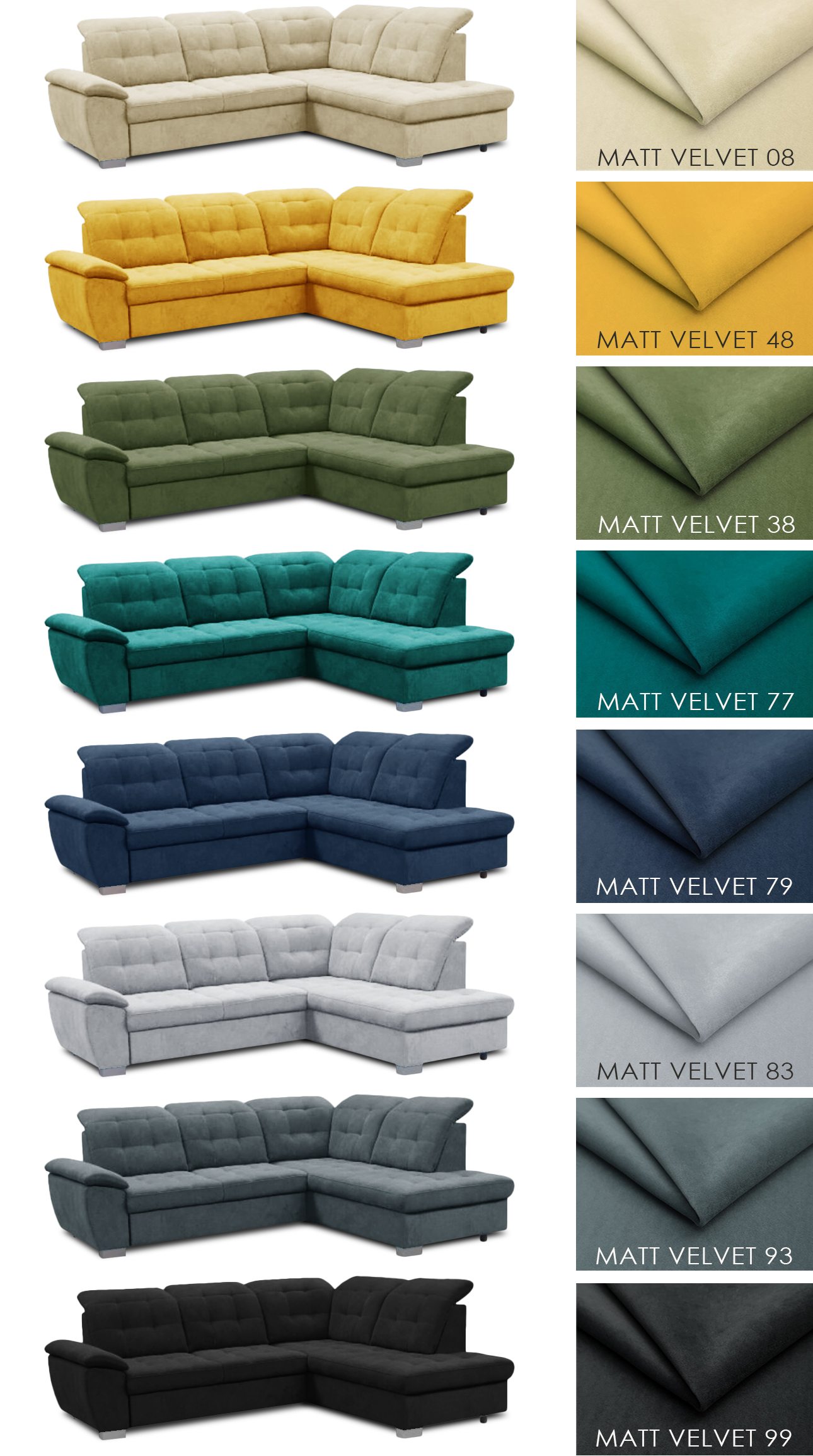Model dostępny jest w wersji lewo- lub prawostronnej, wyposażony w funkcję spania z automatem oraz pojemnik na pościel.